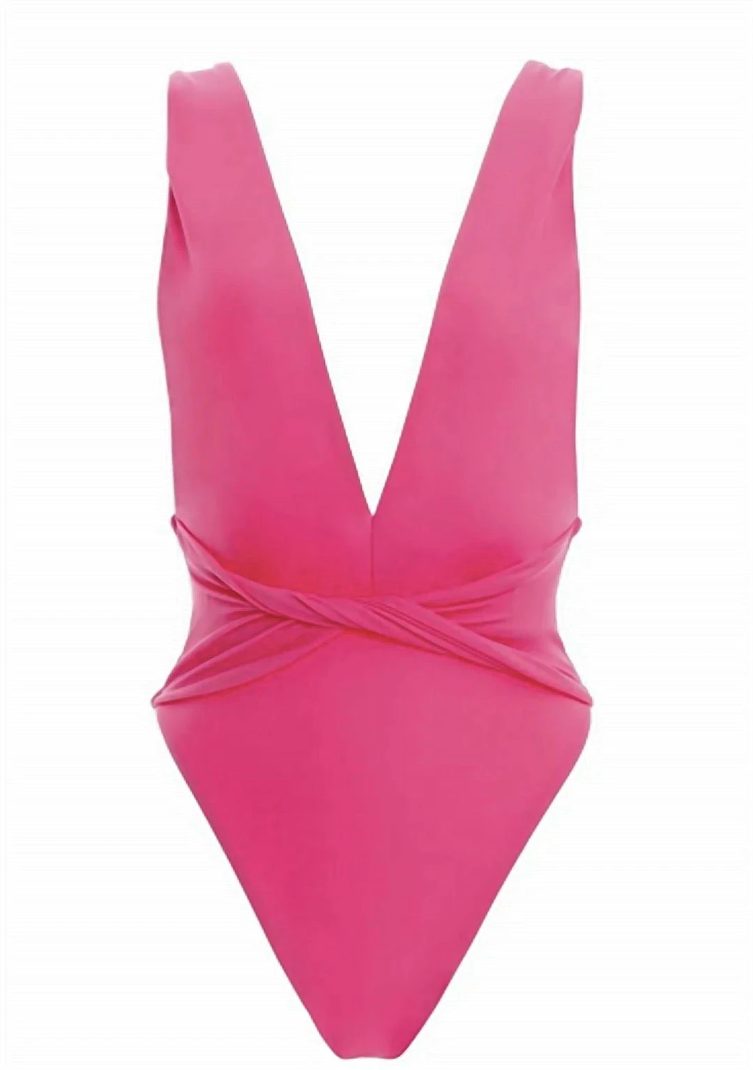 A flattering hot pink one piece, with a deep v neck line that hugs your curves all in the right places.