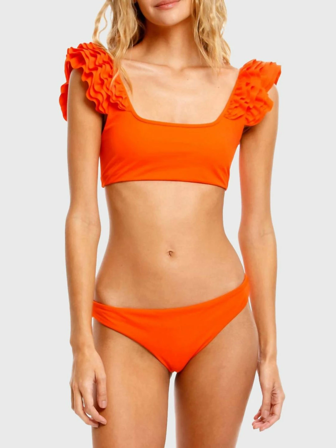 The dramatic, off-the-shoulder frilled sleeve cut top is paired with the Lola bikini bottoms with a cheeky fit. Bright orange bikini top and classic bottomsOff-the-shoulder fit, frilled shoulder detailFully lined, cheeky fit bottomsMoisture wicking and quick-dryMachine WashableModel is 5’7″, wearing S