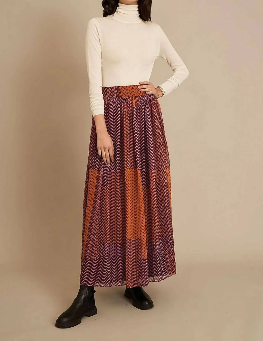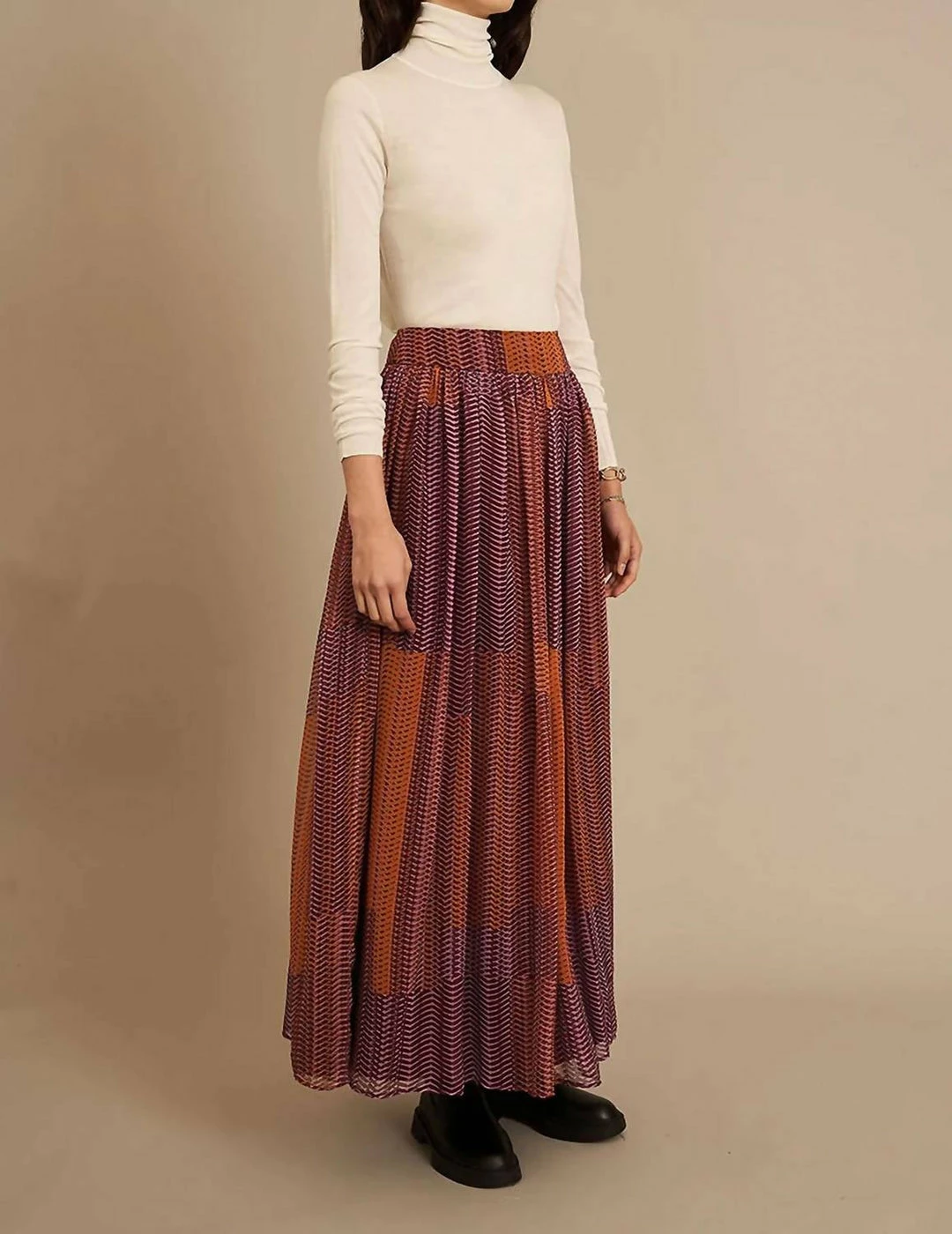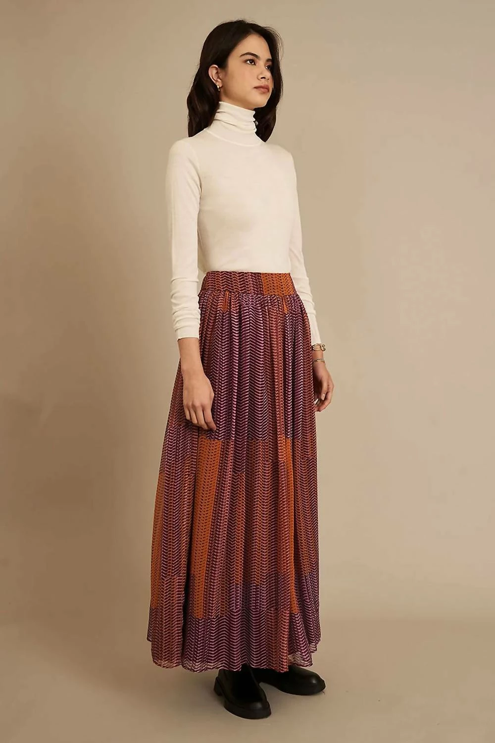 This midi-length skirt is designed to elongate the frame. Features a wide waistband and an invisible zipper along the side seam. Long and flowy with beautiful silk chiffon fabric. Violet print is made out of a burgundy and burnt orange tribal pattern.