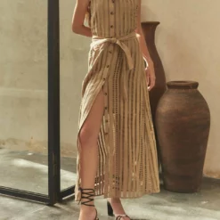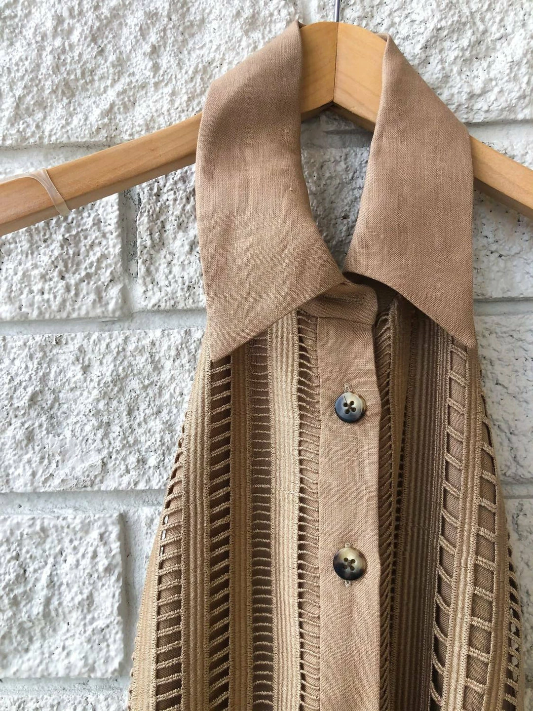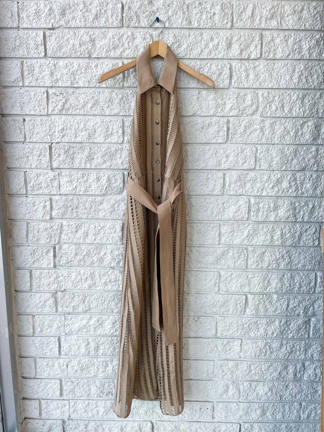 This is a mid-length sleeveless dress that has eyelet lace cutouts and a high collar. It has a full front button closure and a self-tie waistband with belt loops on each side.Care – Hand wash cold or dry clean. Do not tumble dry. Low Iron.