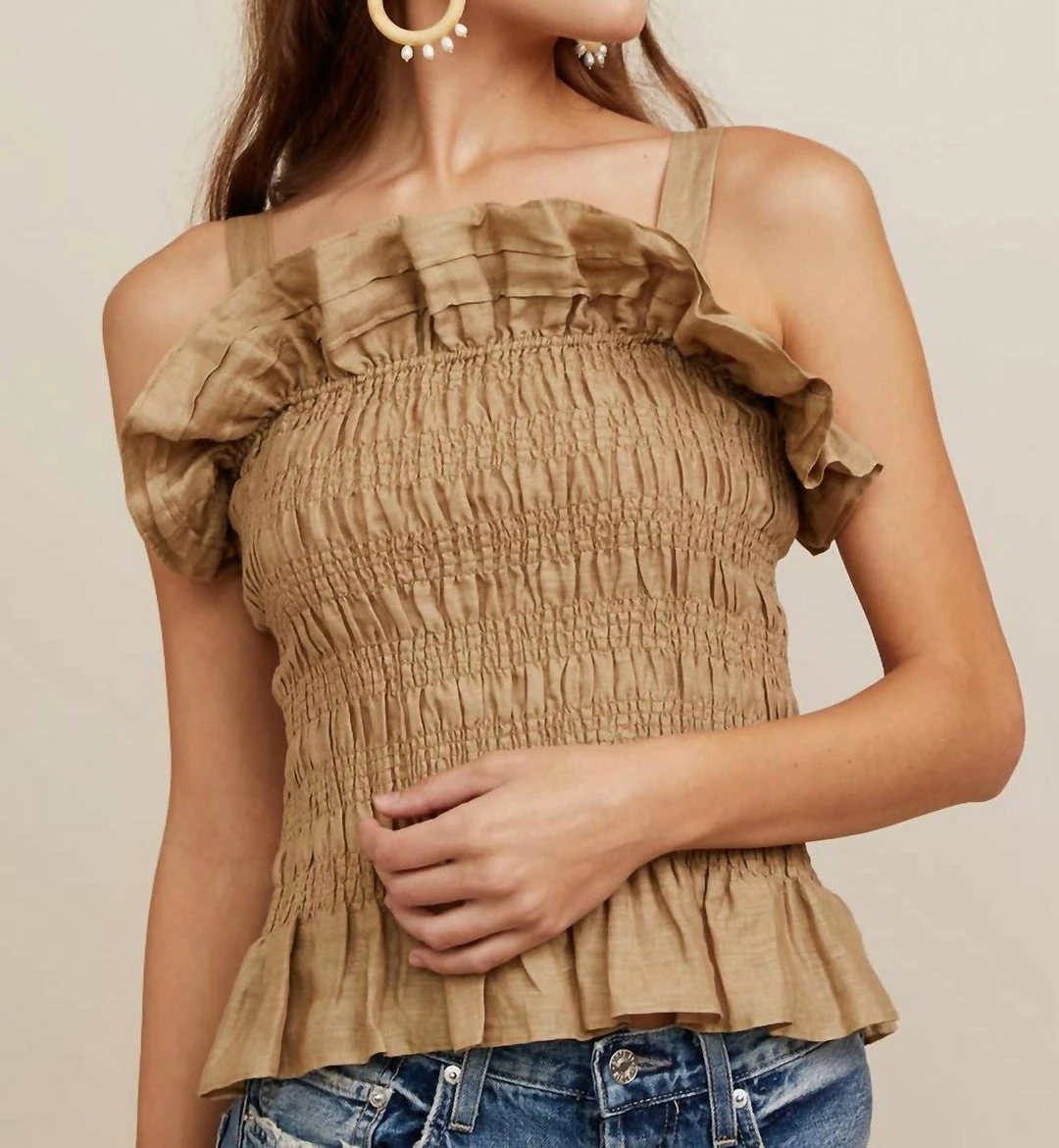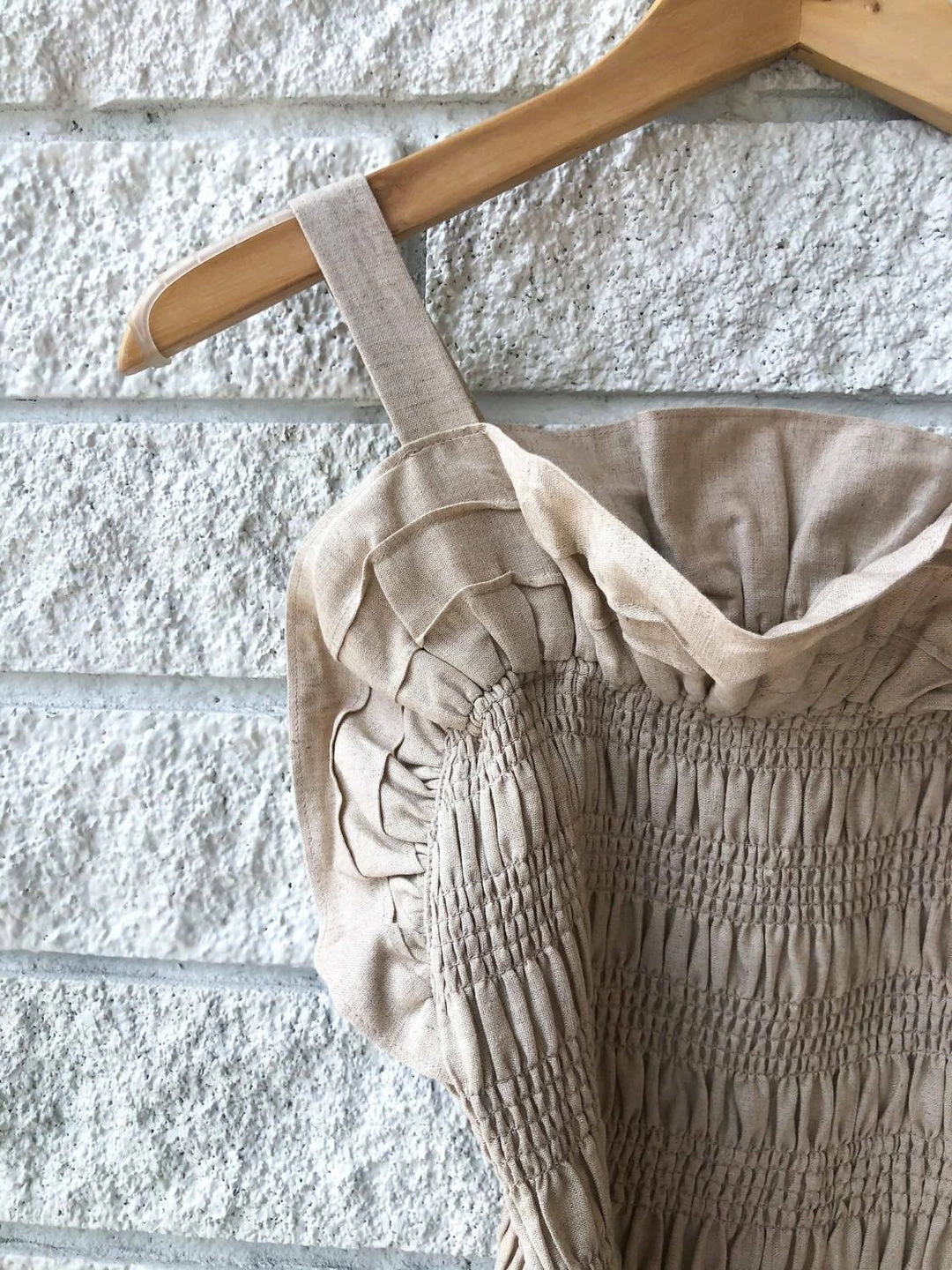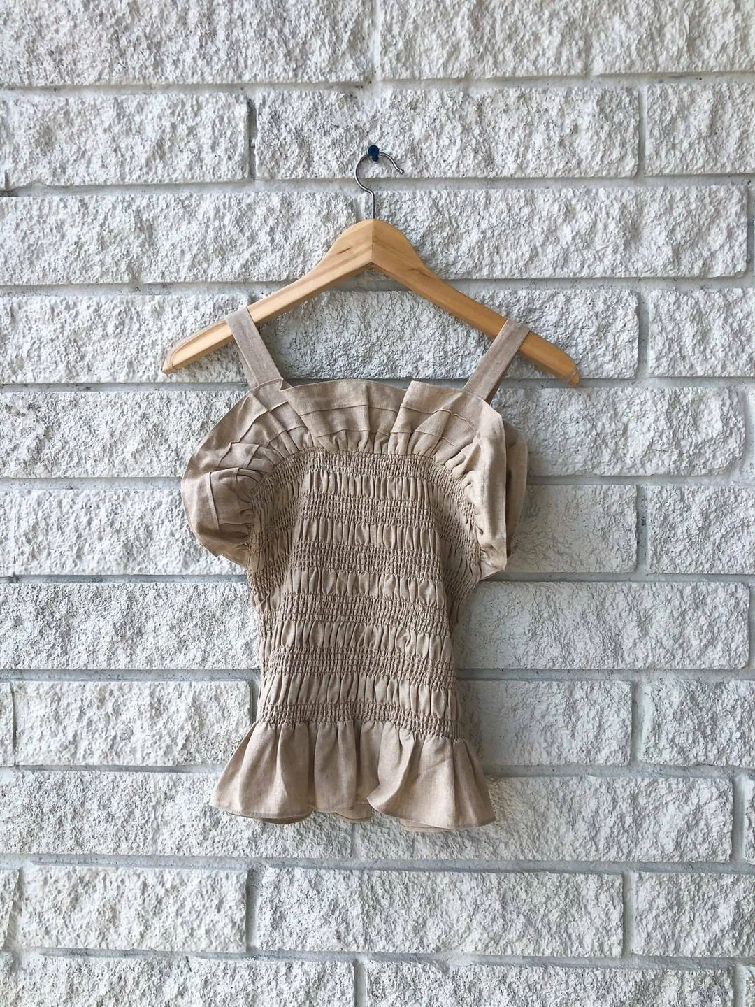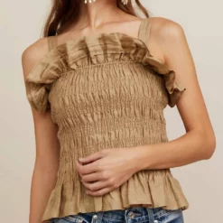 Detailed smocked body and large ruffle trim at the neckline. The same large ruffle detail lines the hemline. The fitted smocked bodice accentuates the ruffle details.��The top also has wide straps around the shoulders for structure.��Care – dry clean only