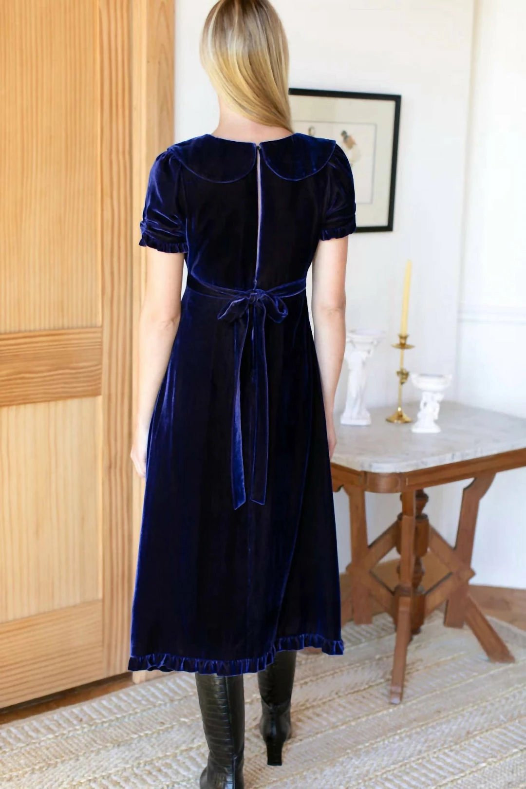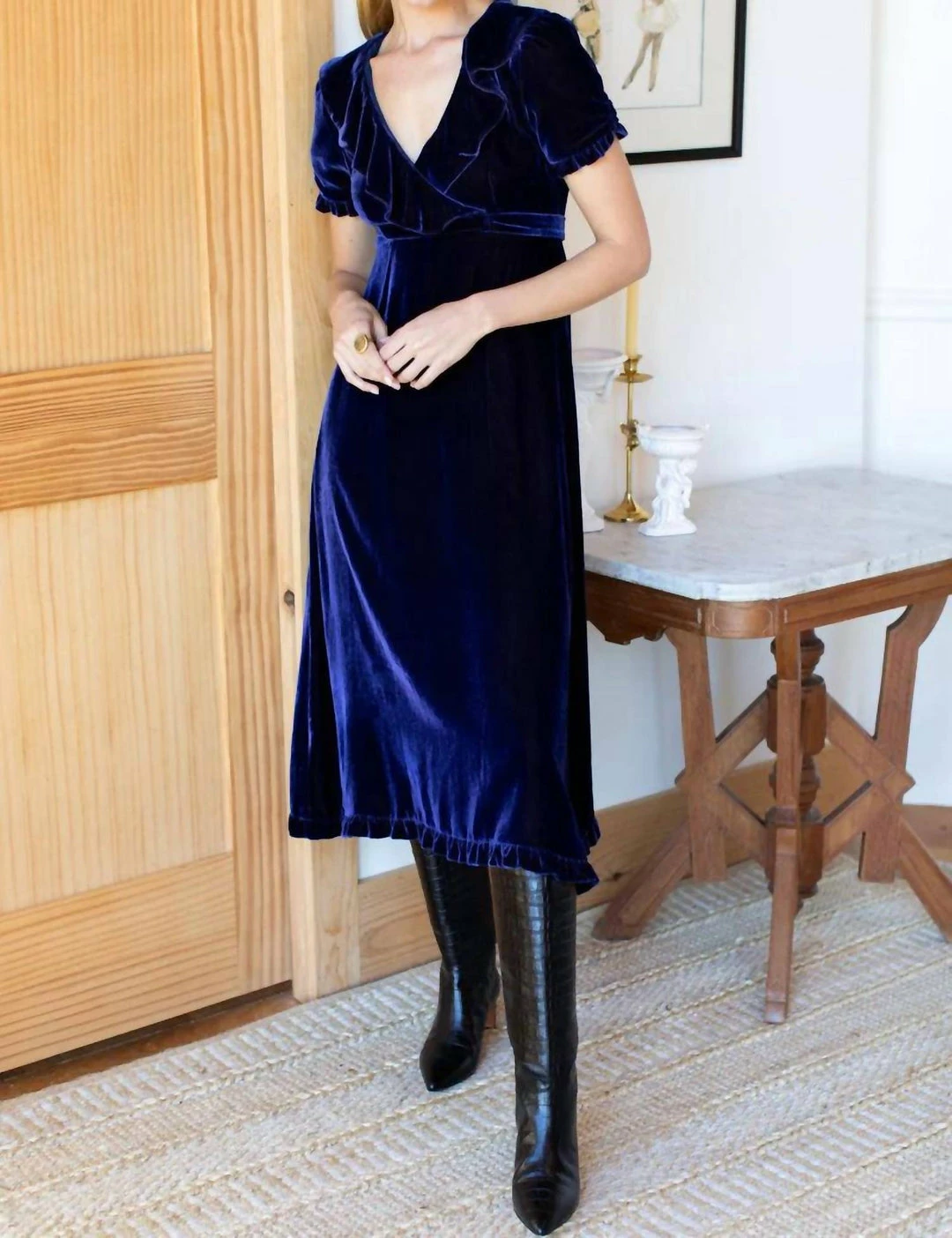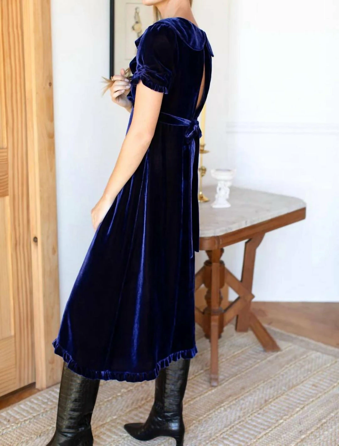 Silk VelvetWrap style bodice��V neckline with draped ruffleEmpire waist with tiesCenter cinched sleeveRuffle detail at cuff and hemMidi LengthLinedHidden zipper at back��Opening at back with button closurePeter Pan detail at back of collarModel is wearing a size small
