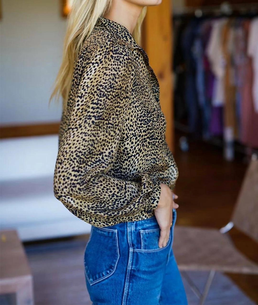 Black with Tigers print.Removable tie sash Set in puff shoulderFull button front closureFull length sleeves with button closure at wrist Model is wearing a size small Dry clean Made in NYC