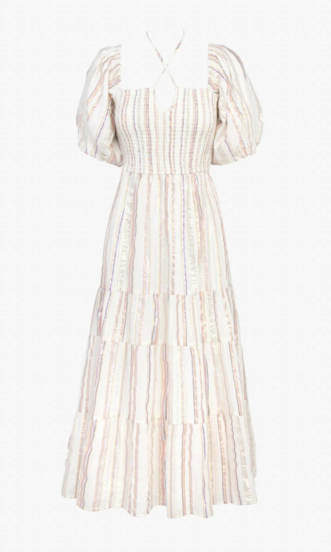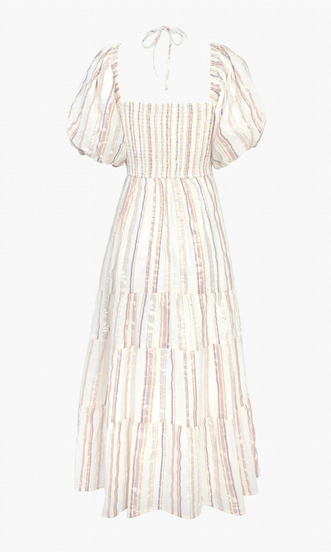 This metallic striped midi dress features feminine puff sleeves, a self-criss-cross halter tie, a smocked bodice, and shirring along skirt.��Lightweight��dressPuff sleevesSmocked��Tiered��CottonLinedLength – 48 7/8″Chest – 15 1/2″Hand wash cold water with similar colors.��No bleach. Low Iron. Dry flat or dry clean����Model is wearing a size small