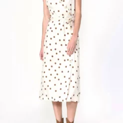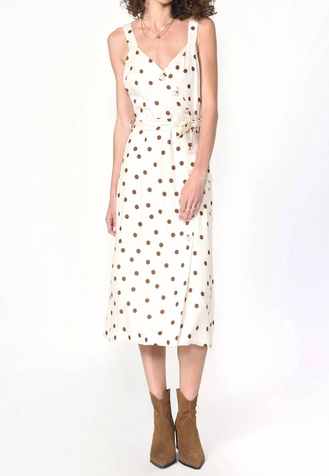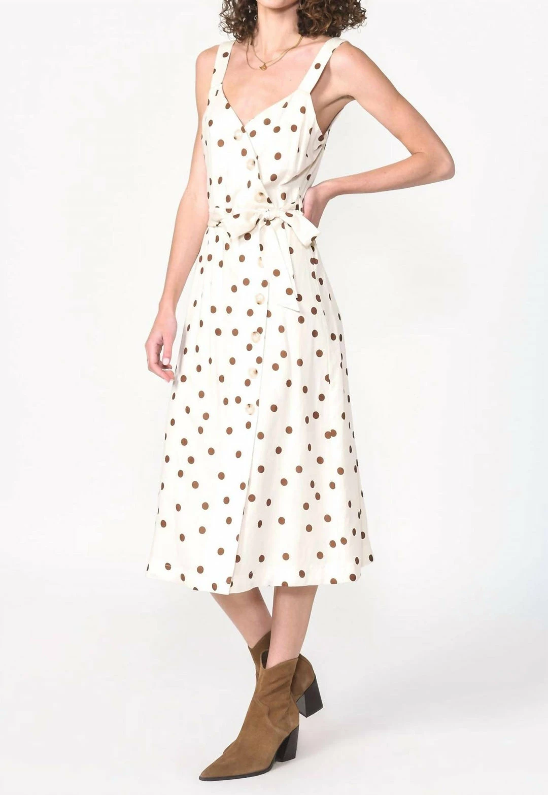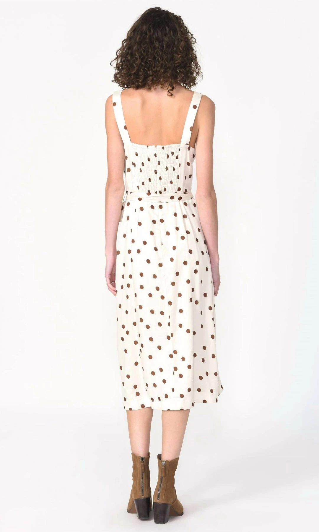 Wear your dots. The Rhea Midi Dress features an all-around polka dot print, thick straps, v-neckline, self-tie sash, and button-up closure.��Polka dot midi dressTie sash��Horn buttons��Smocked bak��Invisible zipper closure��Length – 47 1/2″Chest – 17″Hand wash cold water with similar colors.��No bleach. Low Iron. Dry flat or dry clean����Model is wearing a size Small