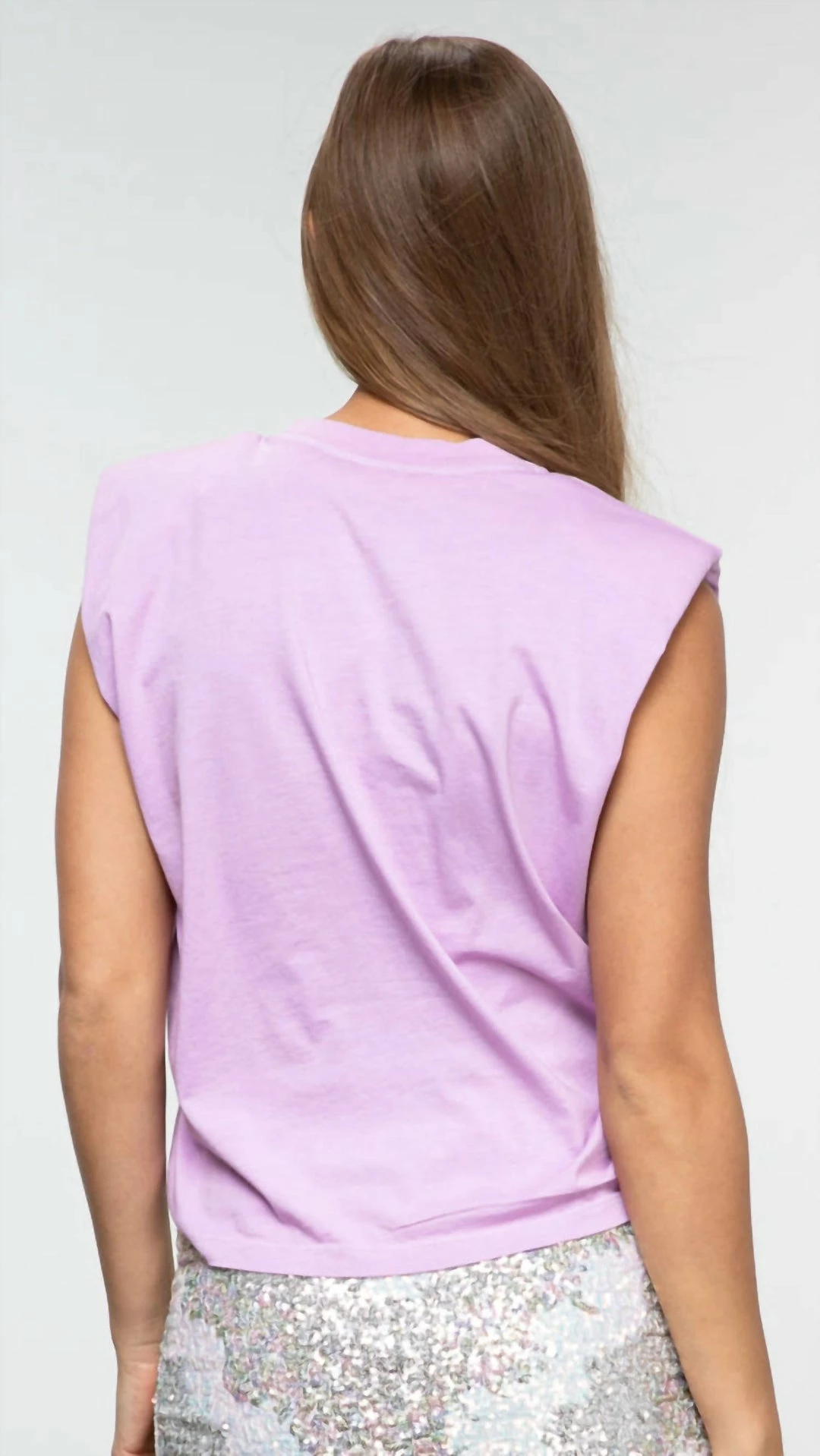 Sleeveless muscle tank in amethyst (purple)Subtle shoulder paddingMachine washableModel is 5’10”, wearing XS