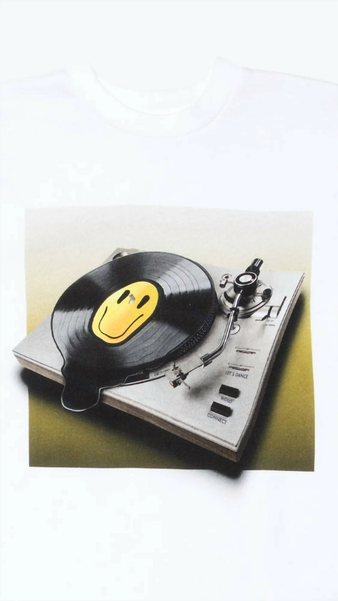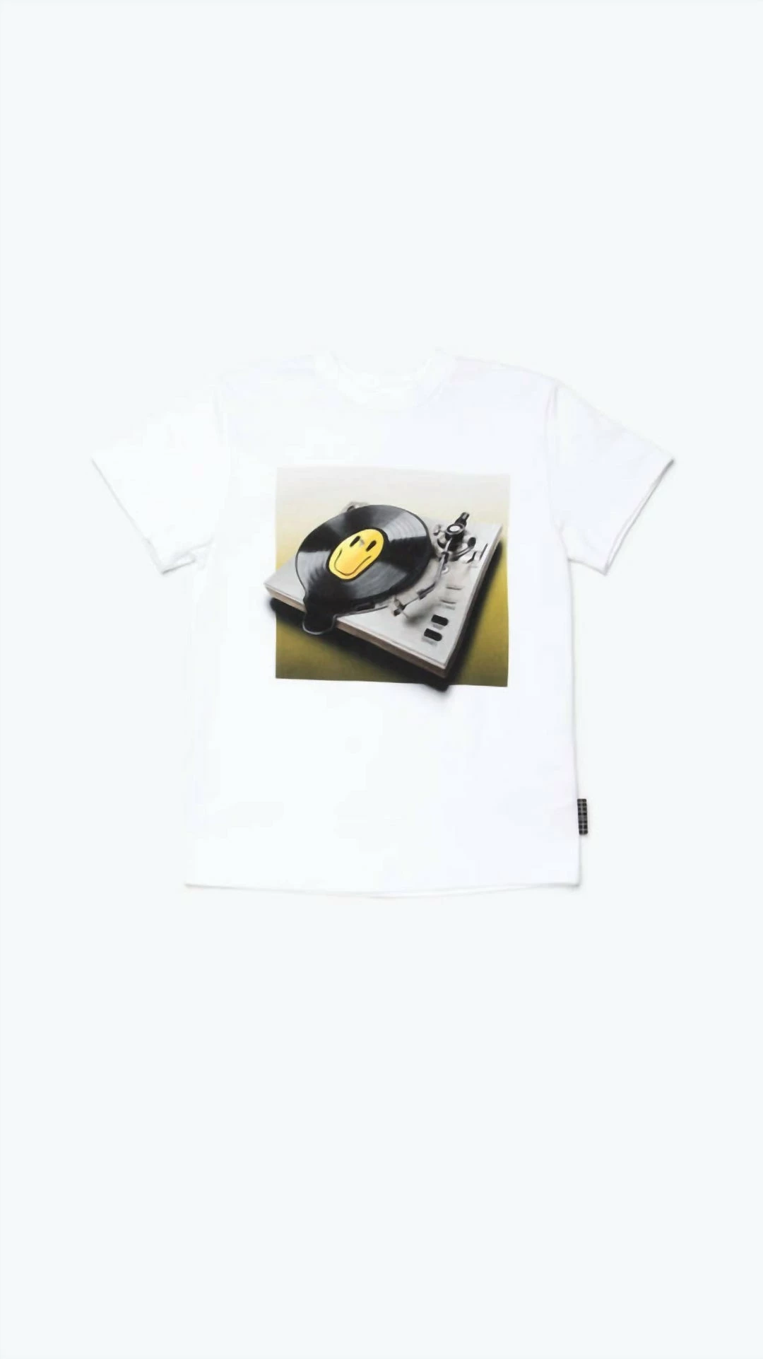 Boy’s t-shirt in white with melting smiley record player graphicCrew neckShort sleeveMachine washable