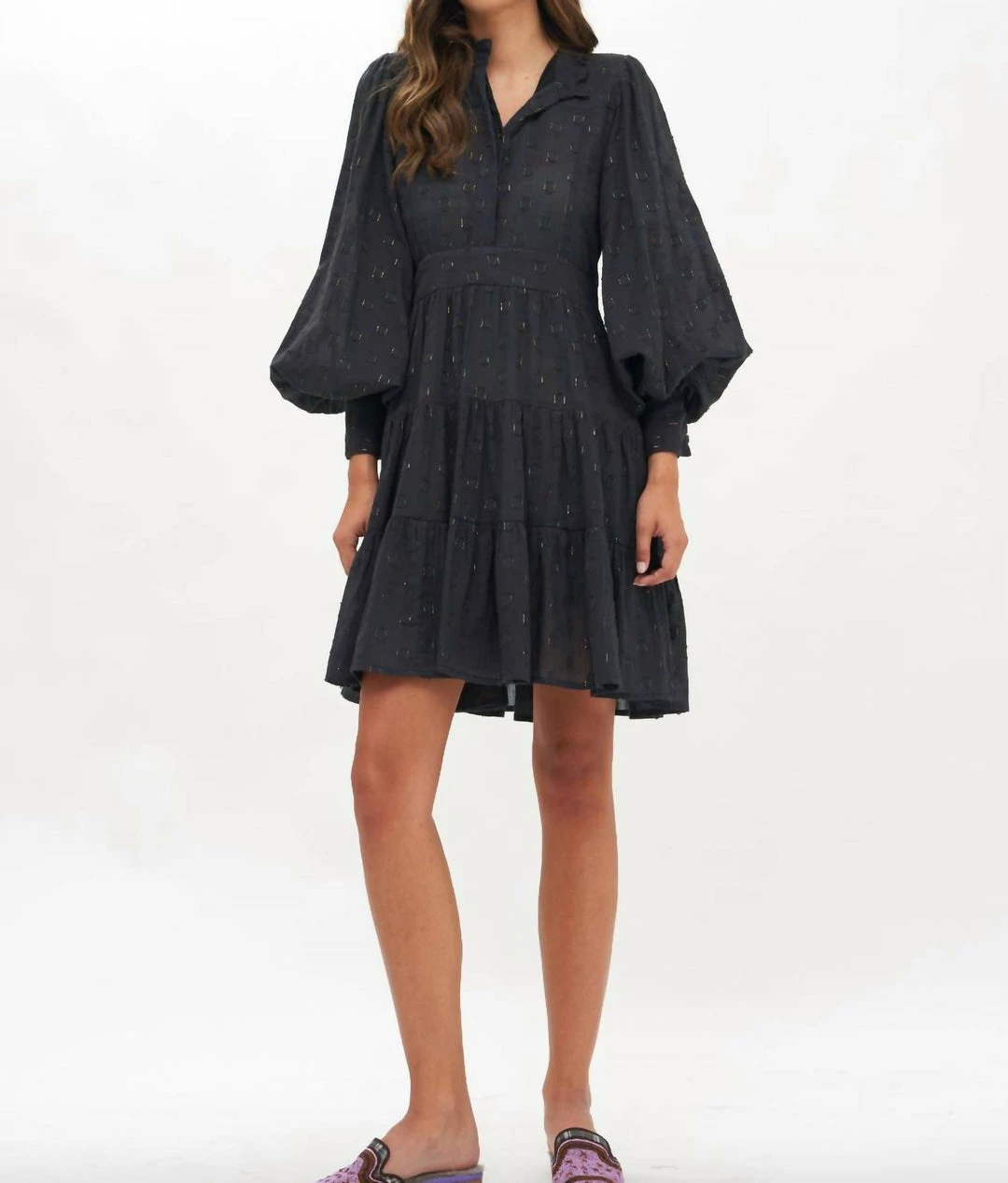 Made from a cotton voile with gold lurex detailsSplit V-Neck with button closuresRuffle collarFully linedZipper feature along the sideLong sleeves with tailored cuffs and button detailing Model is 5’8″ and is shown wearing a size Extra Small