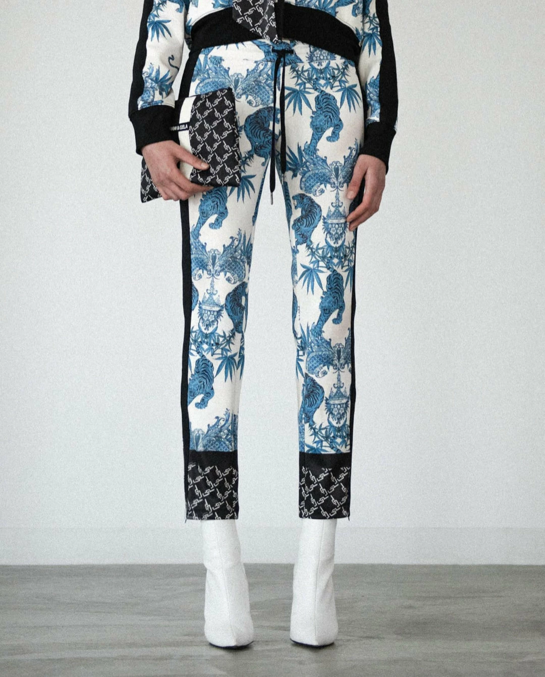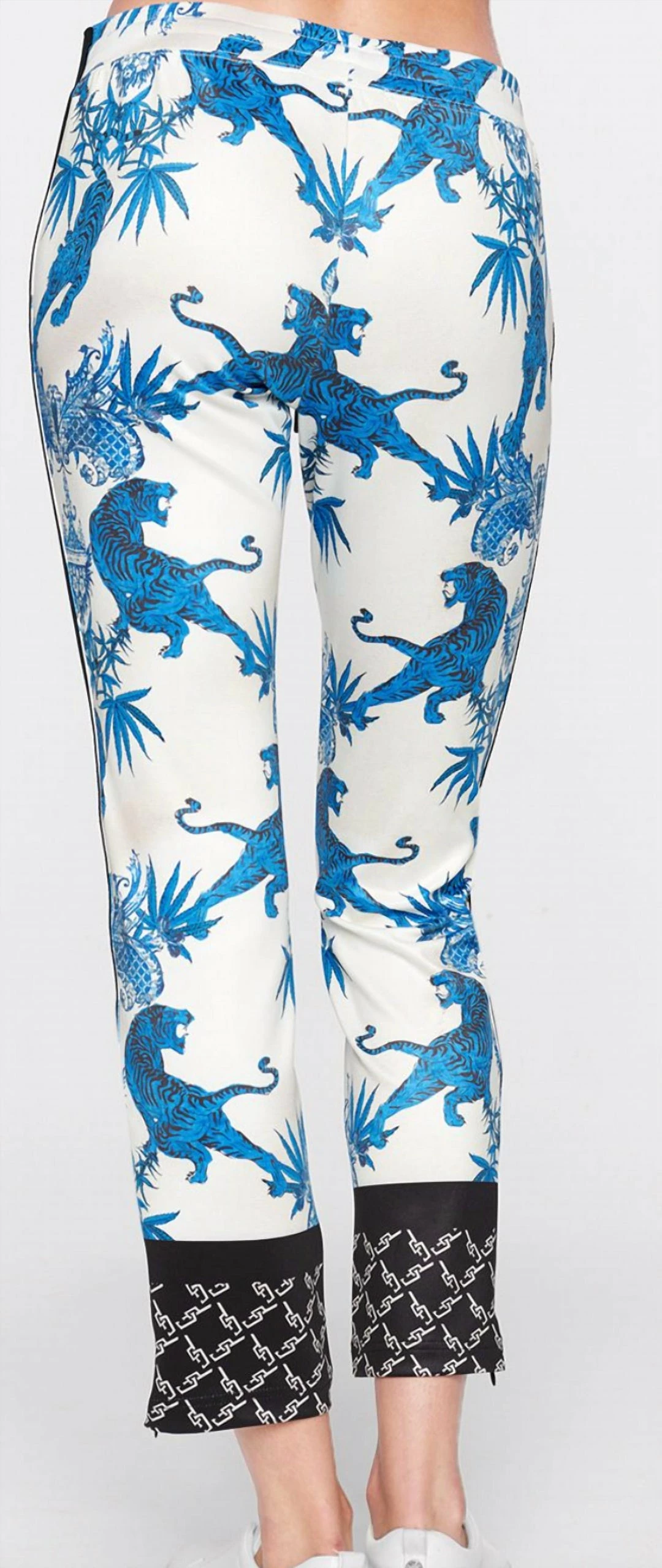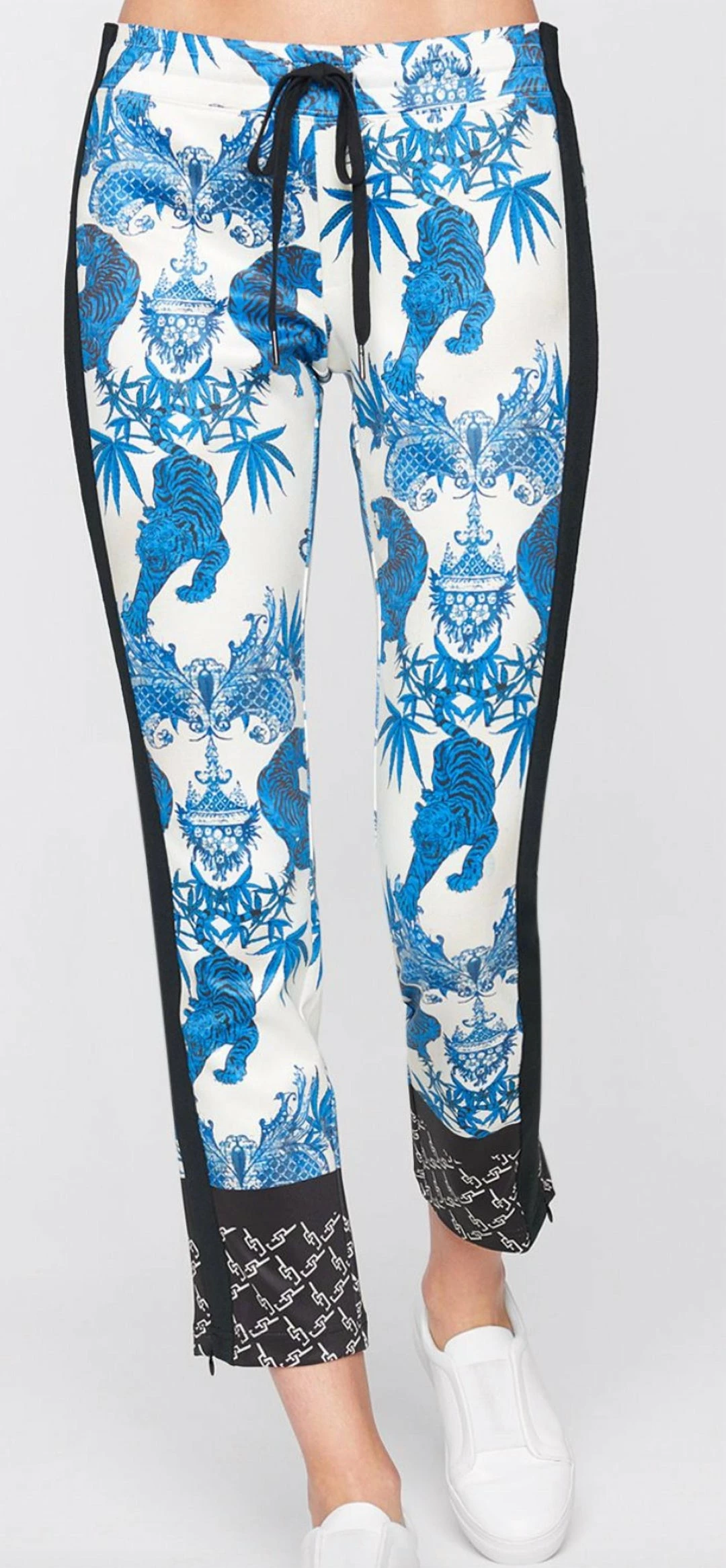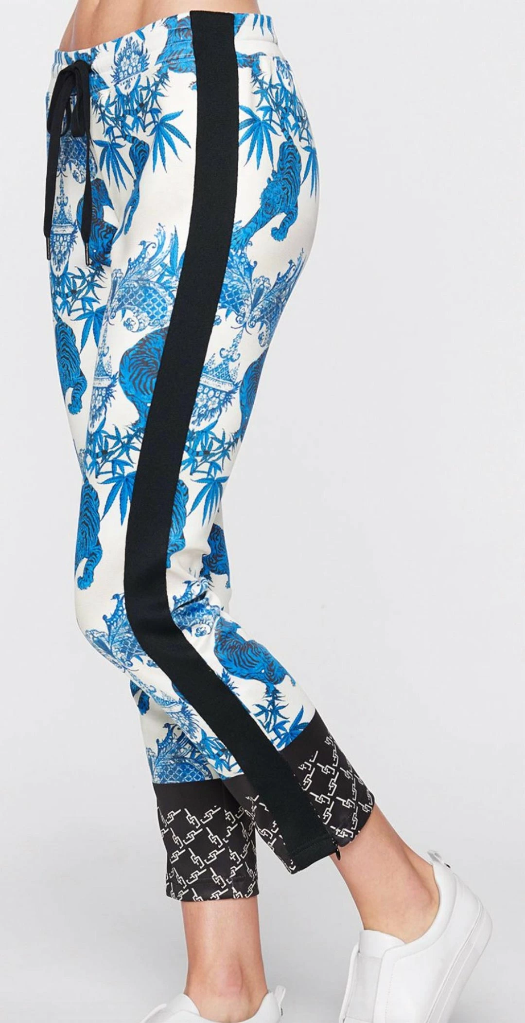 Cropped side stripe jogger with drawstring waist and zipper detail at ankles.95% POLYESTER 5% SPANDEX