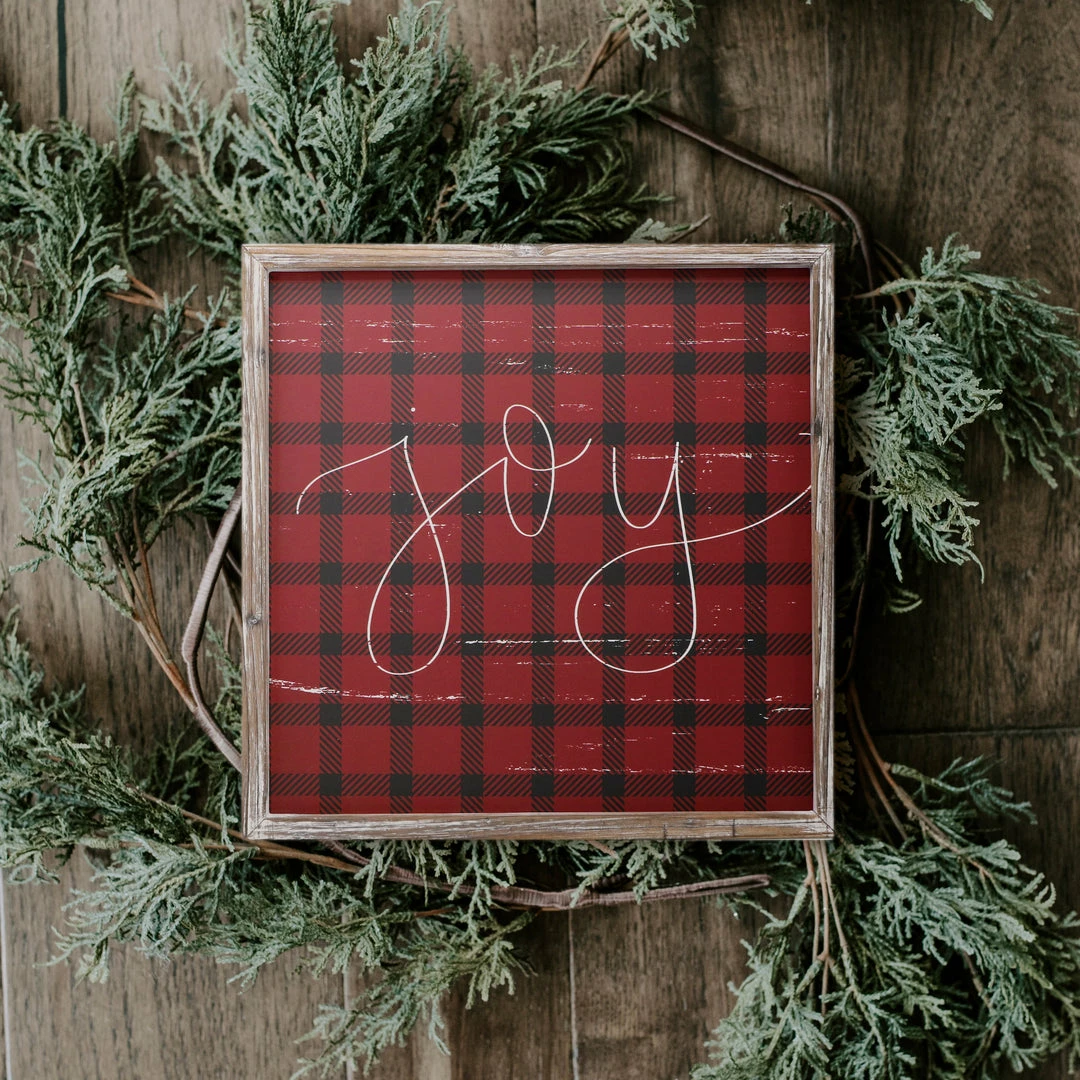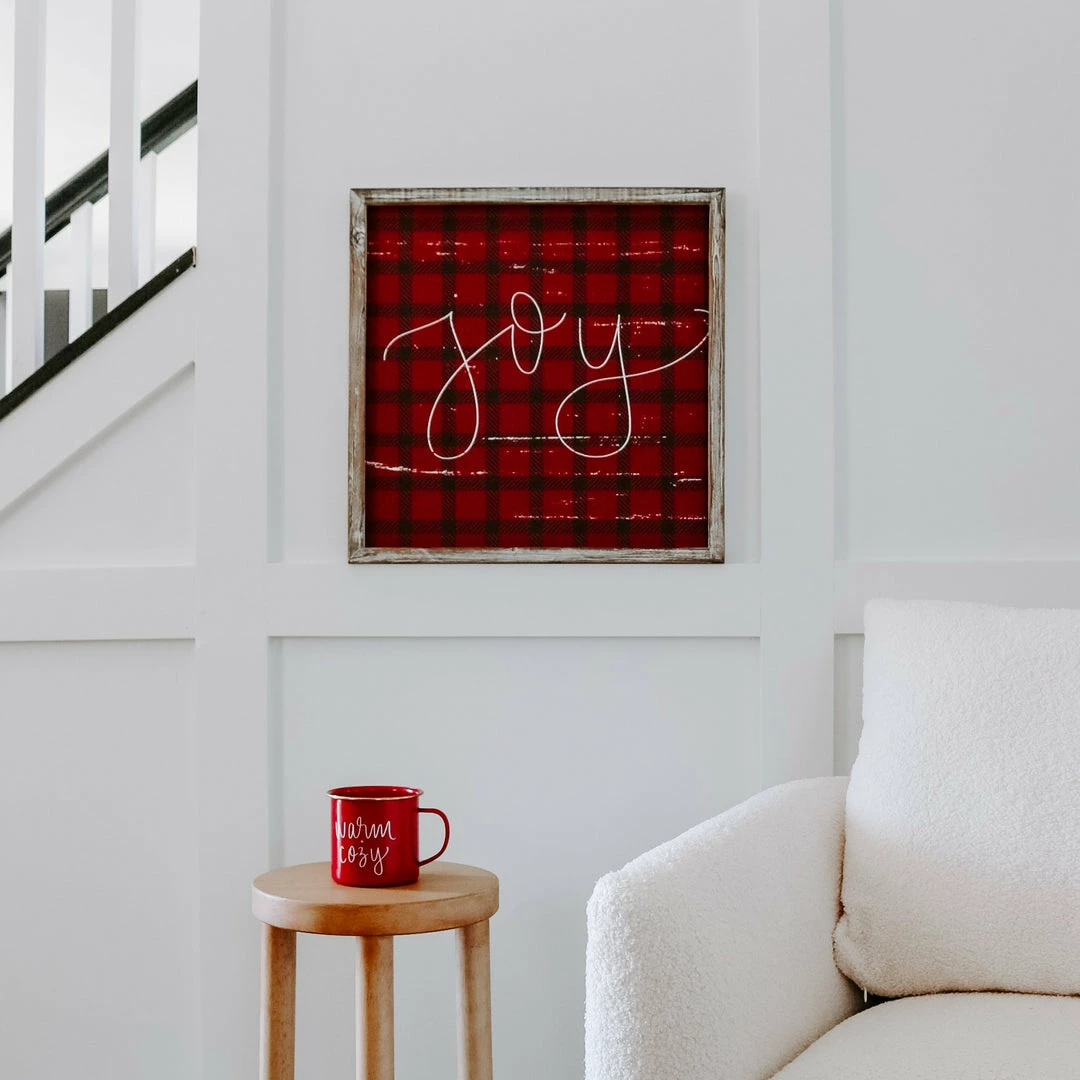 Decorate for the holidays with our Joy plaid wood sign. This hand lettered, rustic sign is painted with a beautiful red plaid and is handmade – each sign is unique.