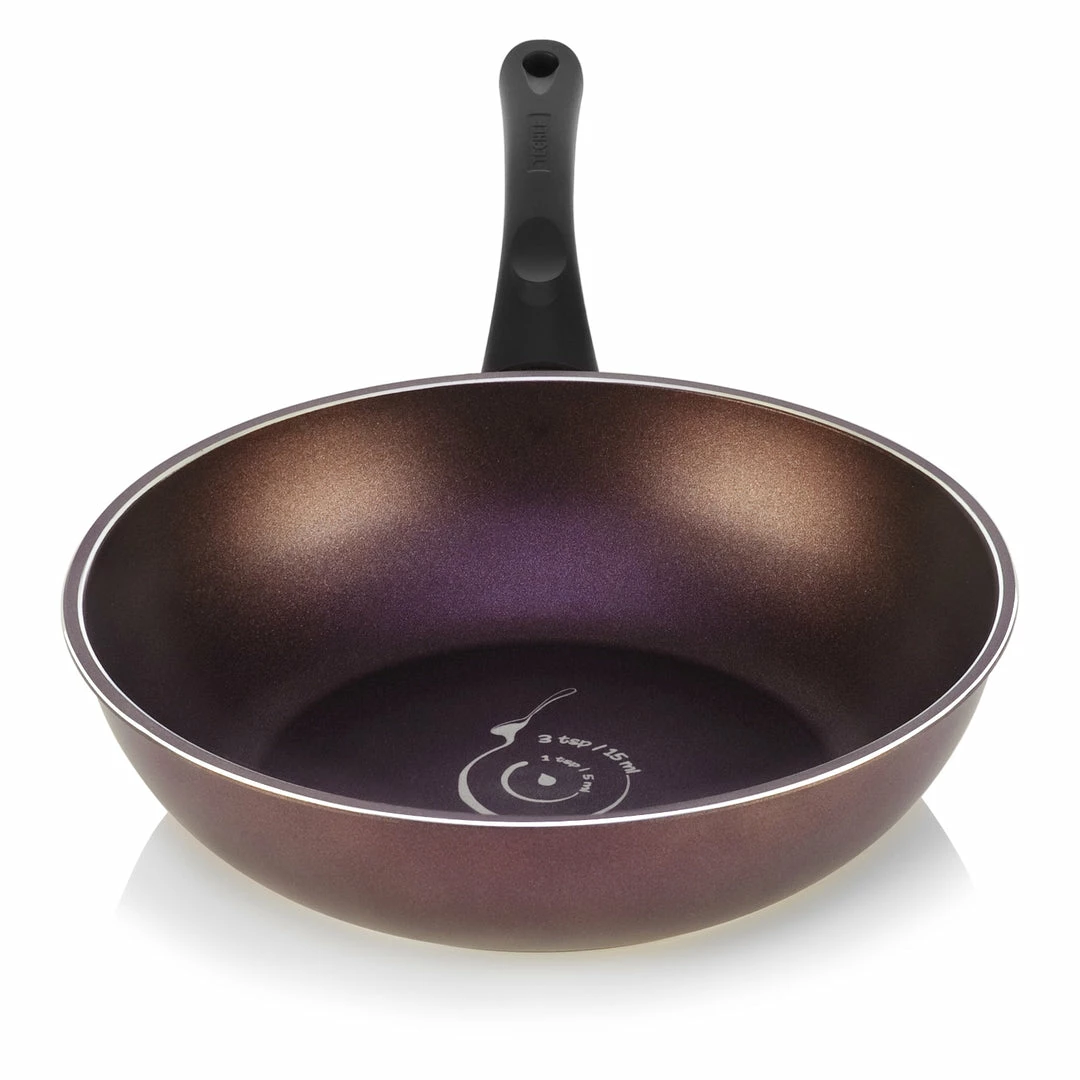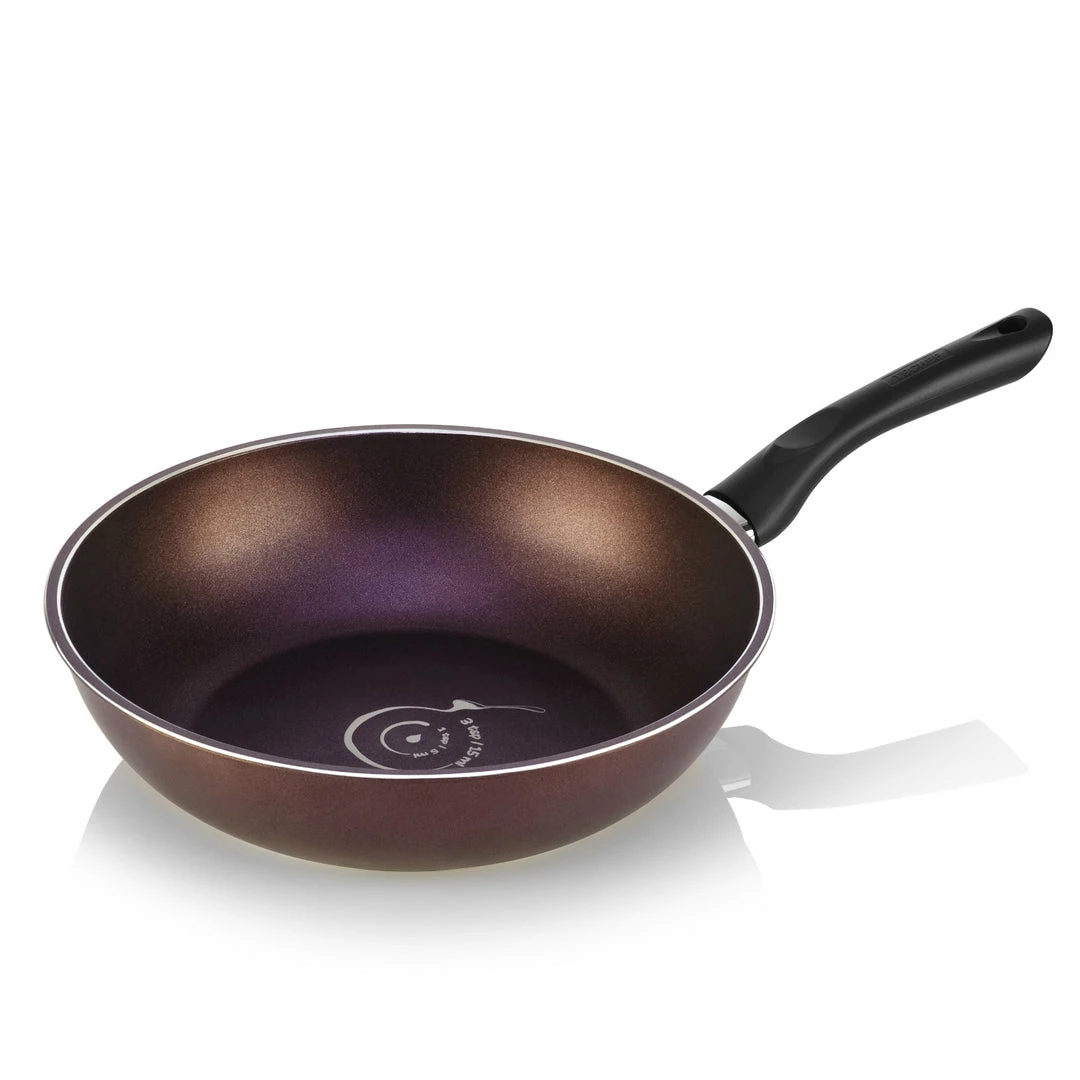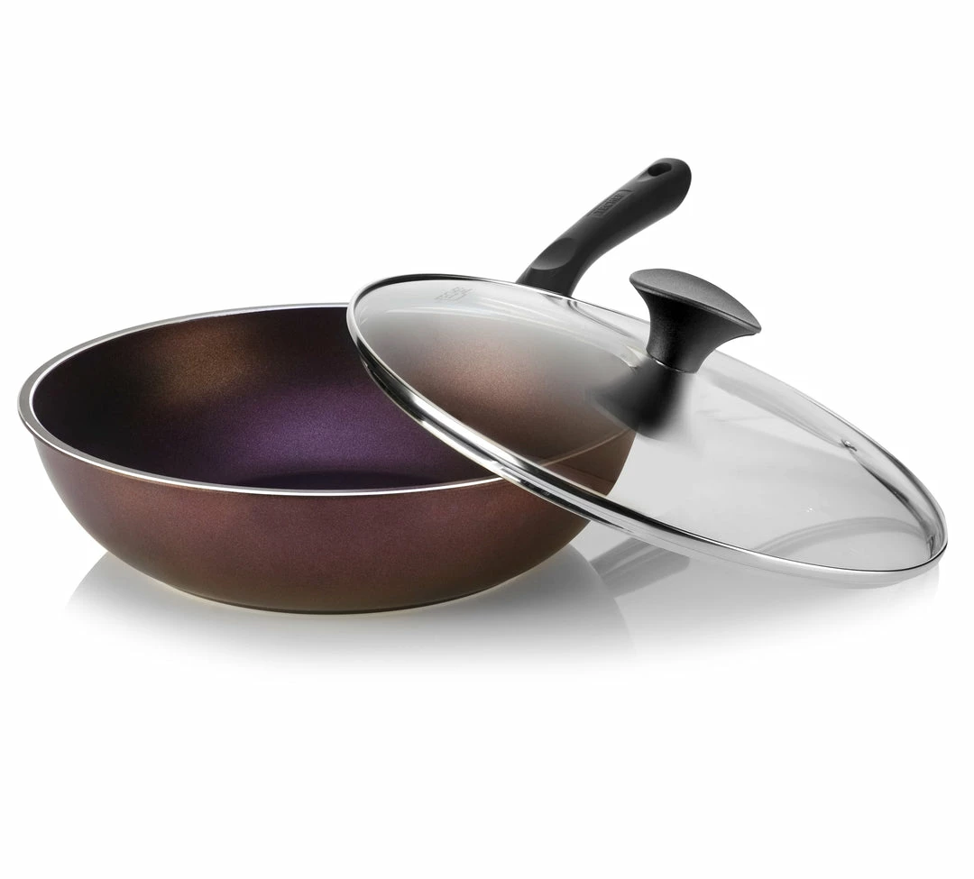 The uniquely designed and decorated Art Pan 12 Inch wok with cover is made with a 5 layer of nonstick coating using Teflon Print Design technology – an innovative and safe method for applying color and prints without harmful external paints. Besides, the pattern on the pan helps in cooking better and healthier food with the right amount of oil. It is an excellent tool for reliable daily cooking and made from the forged extra-heavy gauge aluminum construction with stainless steel base. It is suitable for INDUCTION and all other cooktops and has No PFOA, No Cadmium, and No Lead.