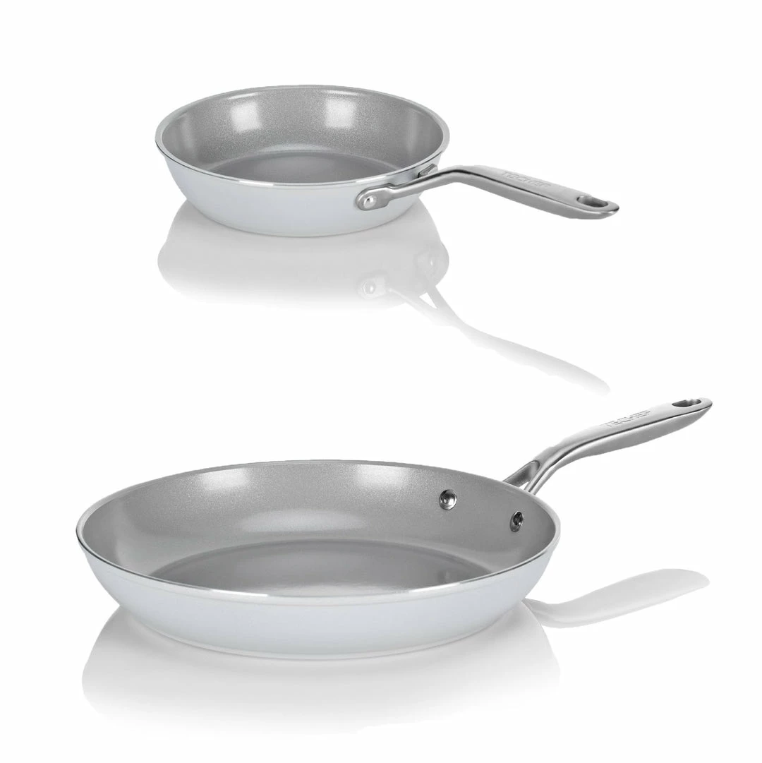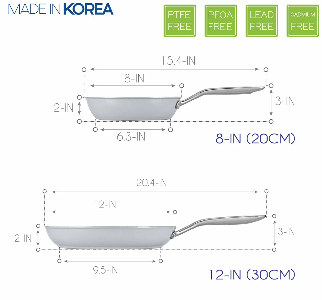 The elegant and stylish CeraTerra 8″ and 12″ frying pan set is made with a healthy ceramic nonstick coating. It is an excellent tool for reliable daily cooking and made from the forged extra-heavy gauge aluminum construction with stainless steel base. It is suitable for INDUCTION and all other cooktops and is free of PFOA, PTFE, Cadmium, and Lead.