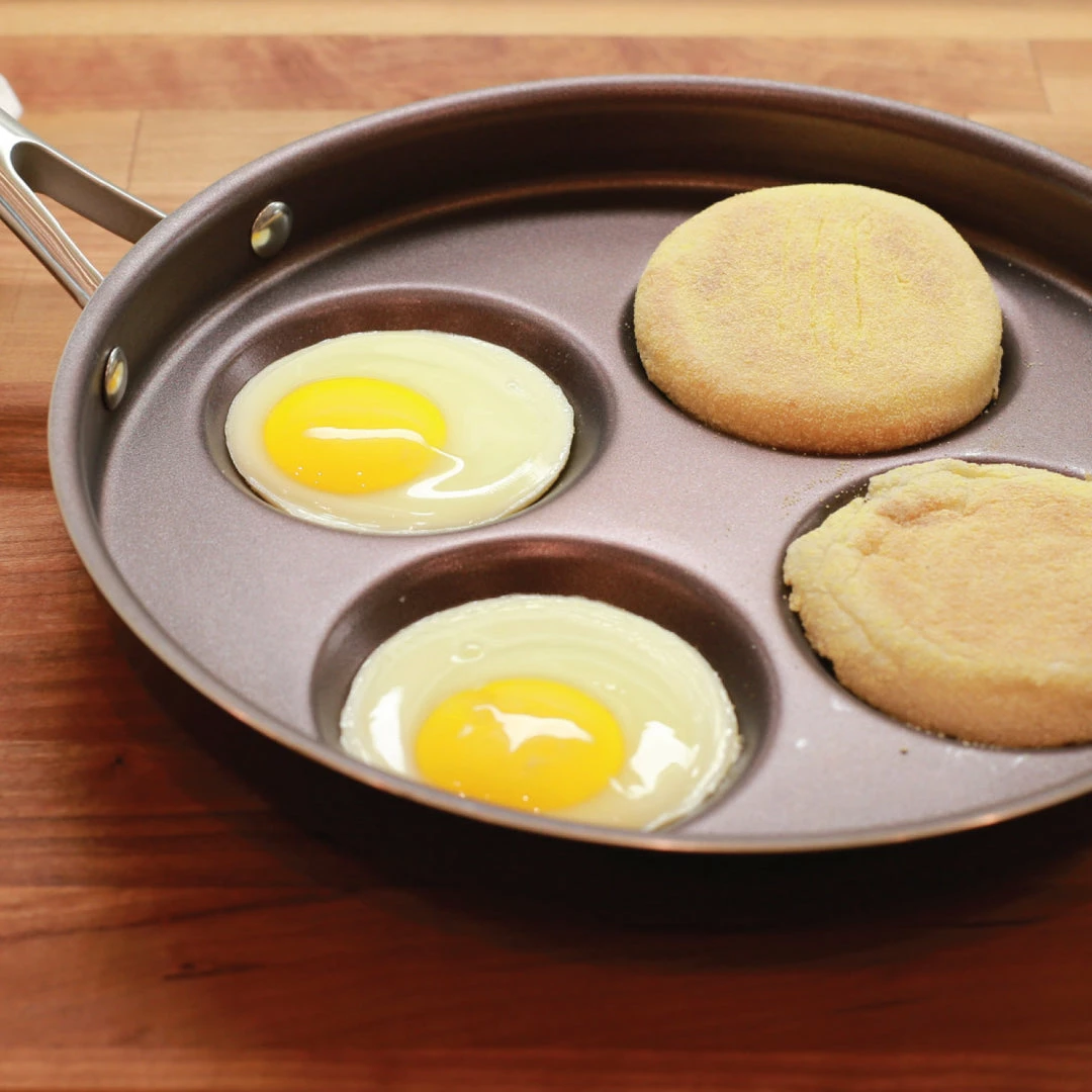 The Eggcelente pan features 4 built-in molds to cook perfectly round eggs, hamburger sliders, mini pancakes, crepe, Jeon (Korean pancakes), and Banh Khot (Vietnamese mini rice pancakes), and more. The long-brushed stainless steel handle remains cool on the stovetop. It is an excellent tool for delivering outstanding performance and exceptional quality while providing healthy cooking.