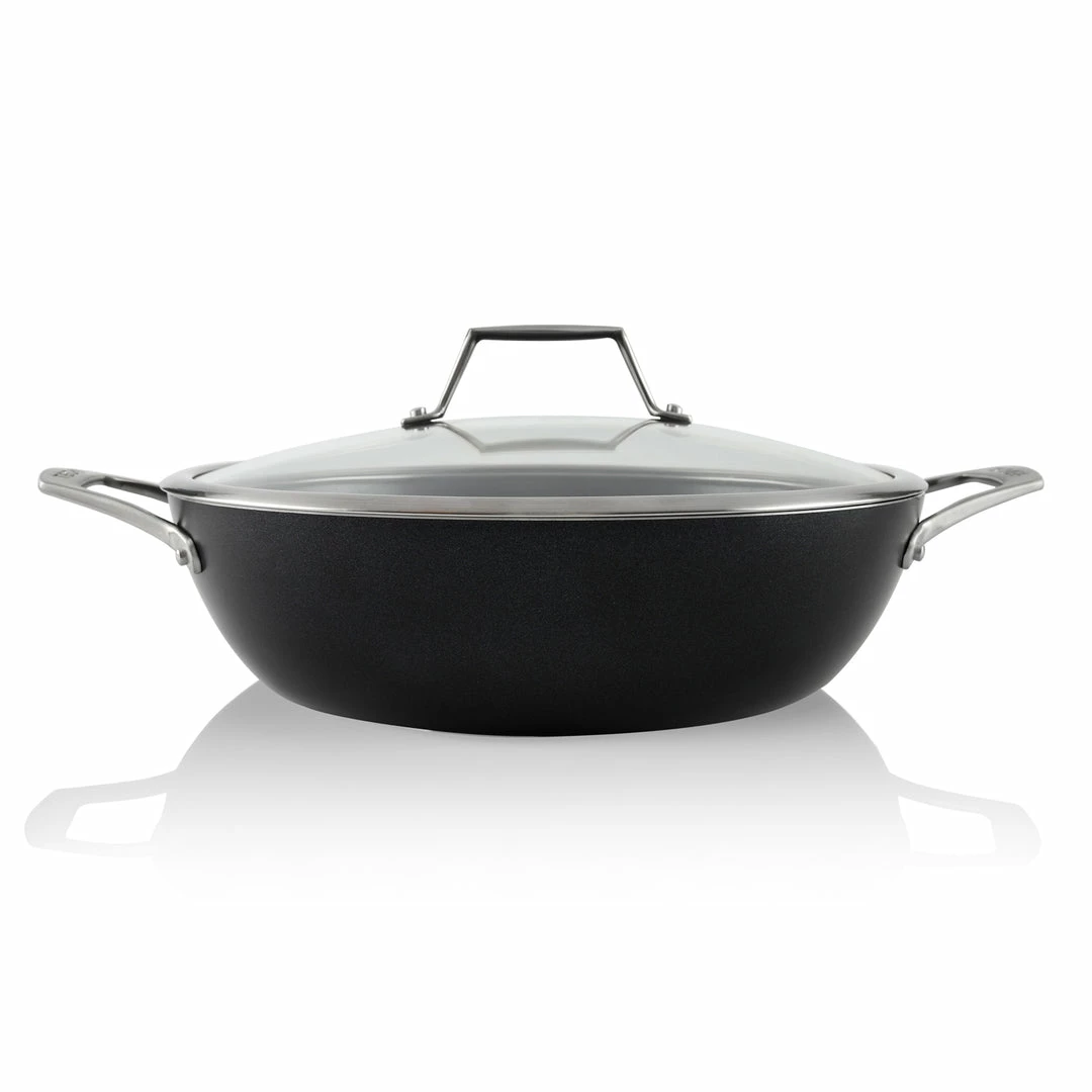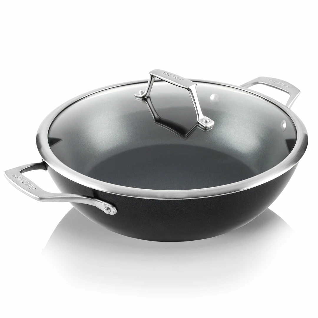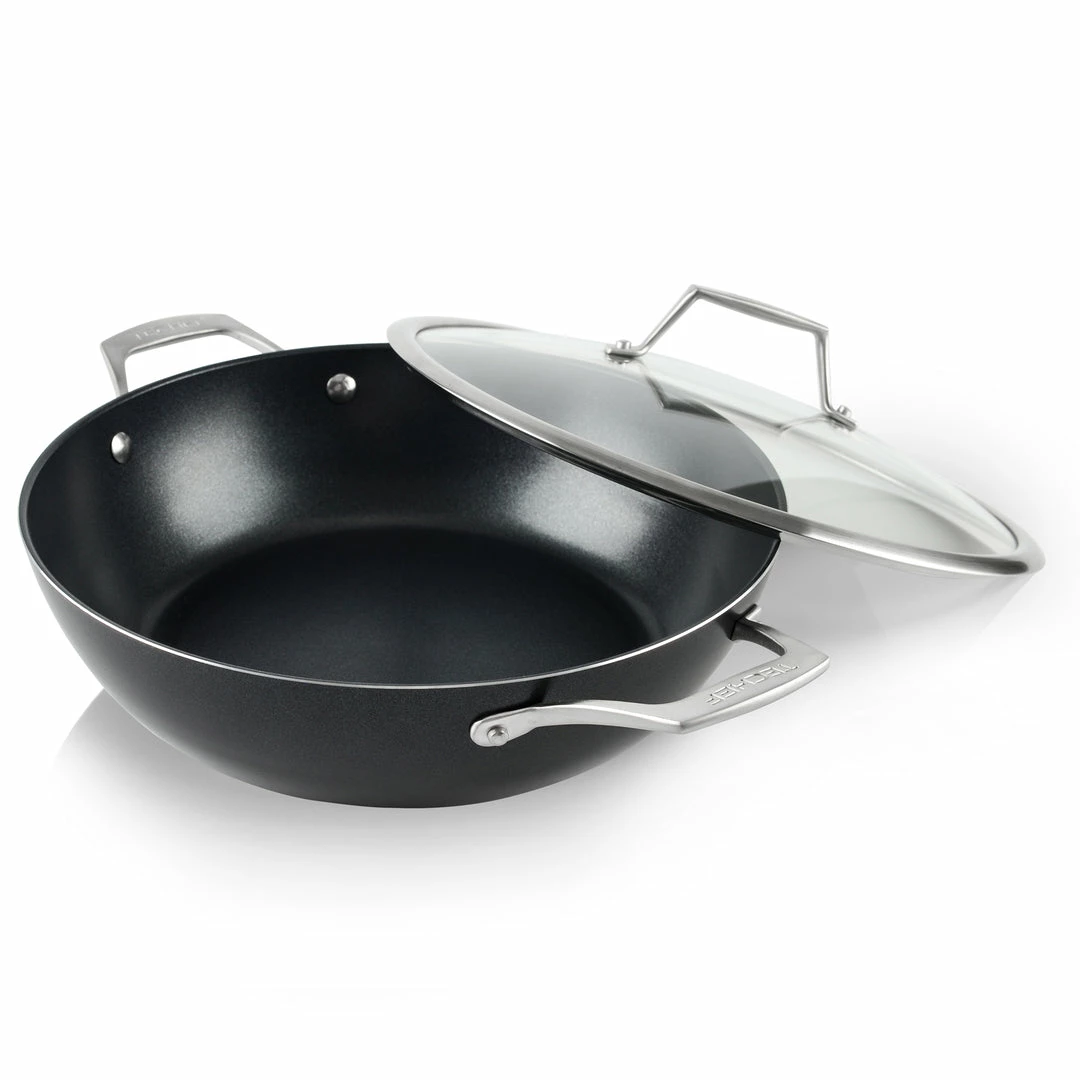The elegant and stylish Onyx 5 Quart Chef Pan is made with a 3 layer of nonstick coating using Teflon Platinum coating. It is an excellent tool for reliable daily cooking and made from the forged extra-heavy gauge aluminum construction with stainless steel base. It is suitable for INDUCTION and all other cooktops and has No PFOA, No Cadmium, and No Lead. With the versatile shape and size – a large flat bottom and tall sloped sides, you can use it for pan-frying, deep-frying, stir-frying, braising, poaching, and more.