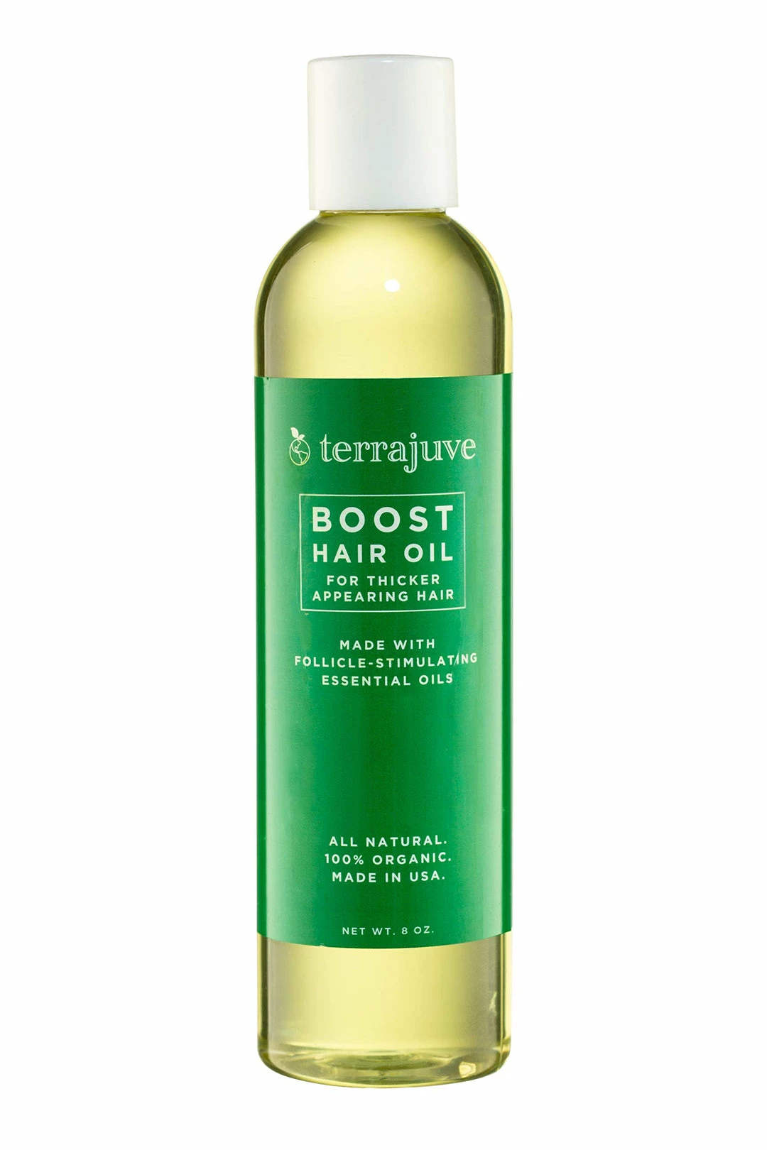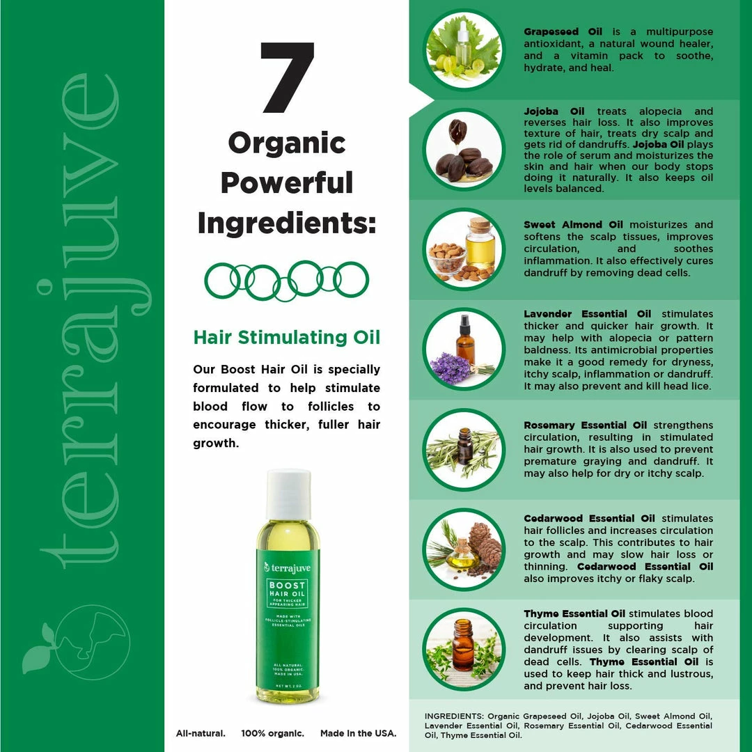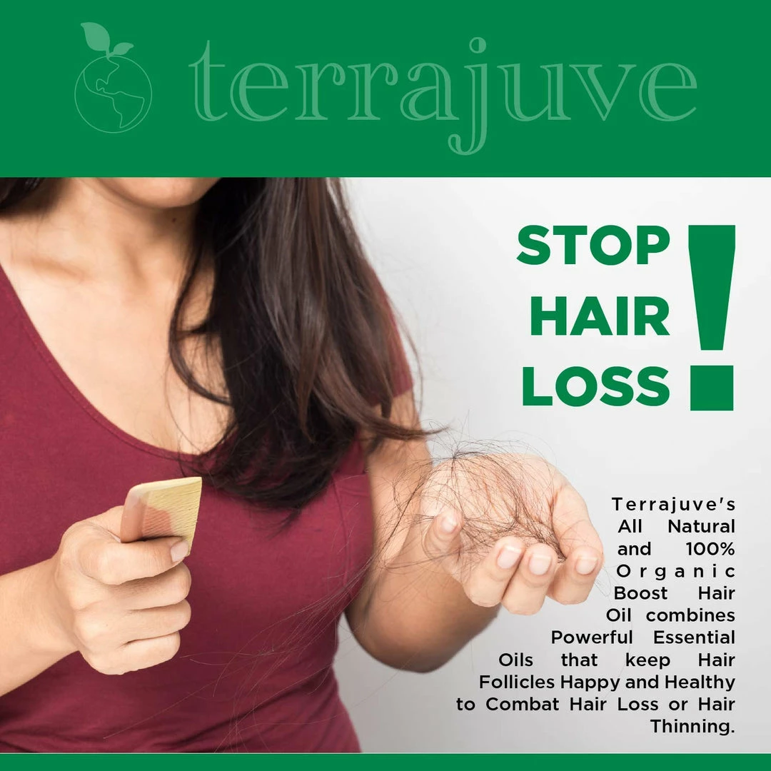 Terrajuve’s all-natural and 100% organic Alopecia Hair Oil combines powerful essential oils that keep hair follicles happy and healthy to combat hair loss or hair thinning. Research has shown, with consistent use, rosemary of these essential oils (1)(2) can encourage improved blood flow to follicles, which can result in more and thicker hair.