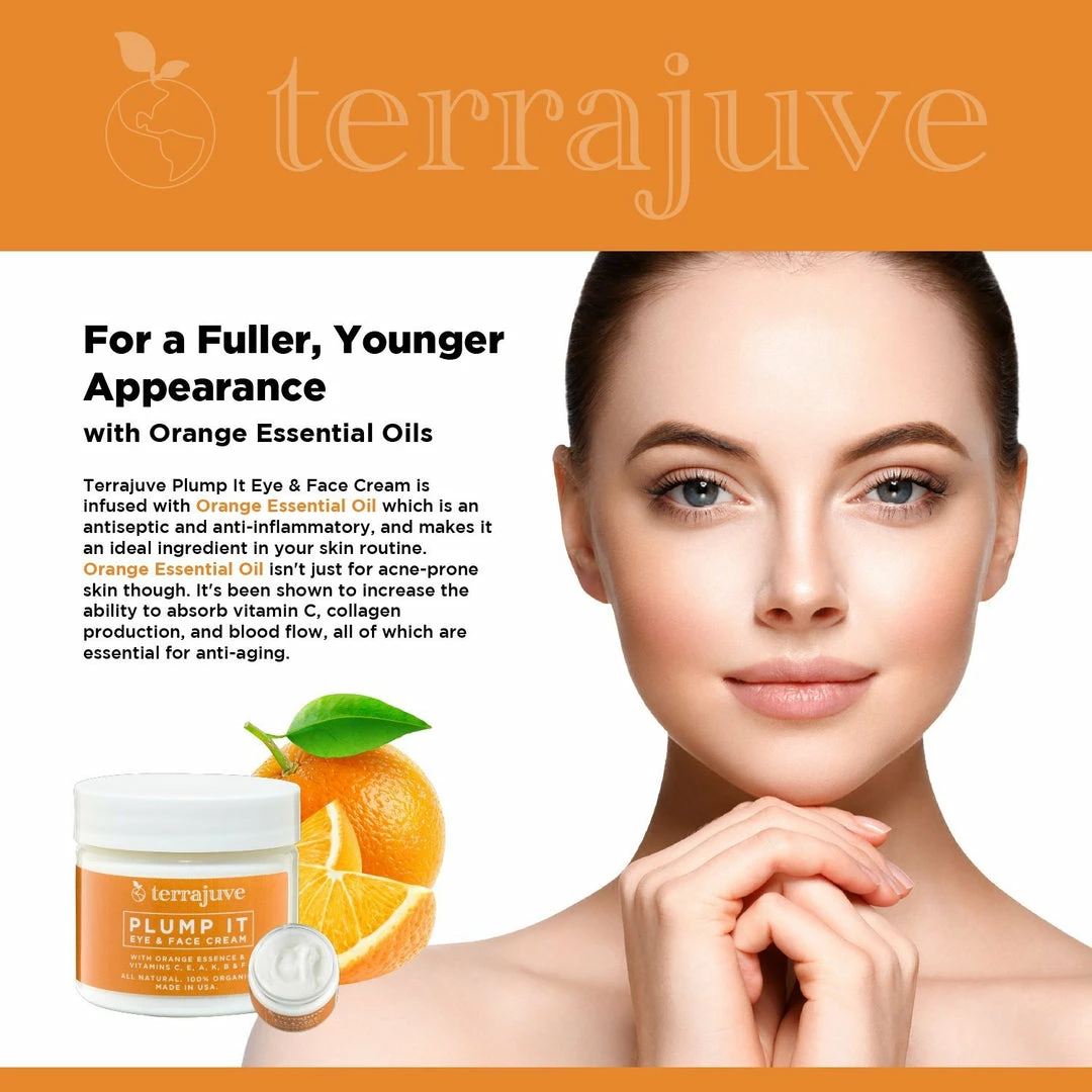 Terrajuve’s all-natural and 100% organic Plump It Eye & Face Cream can help refresh, moisturize and revitalize your most noticeable features. Our powerful combination of shea, cocoa and mango butters, coconut oil (which penetrates skin deeply to protect and preserve moisture), hempseed oil, grapeseed oil and a restorative battery of vitamins help nature do its best to make your skin feel beautiful and renewed.