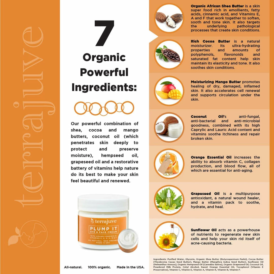 Terrajuve’s all-natural and 100% organic Plump It Eye & Face Cream can help refresh, moisturize and revitalize your most noticeable features. Our powerful combination of shea, cocoa and mango butters, coconut oil (which penetrates skin deeply to protect and preserve moisture), hempseed oil, grapeseed oil and a restorative battery of vitamins help nature do its best to make your skin feel beautiful and renewed.