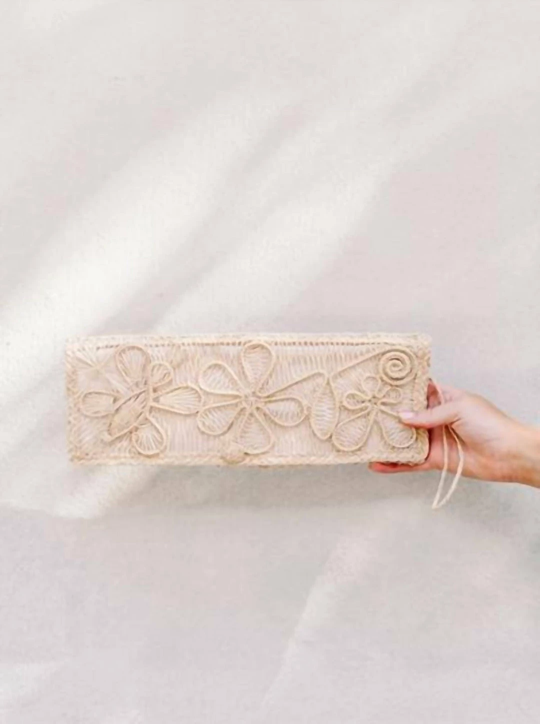 This clutch is lined with white silk, and features 3 crafted flowers and butterflies on the top. This fun silhouette makes it the perfect summer bag.  Woven Iraca PalmRectangularHeight is 13cm by Width of 30cmÂ