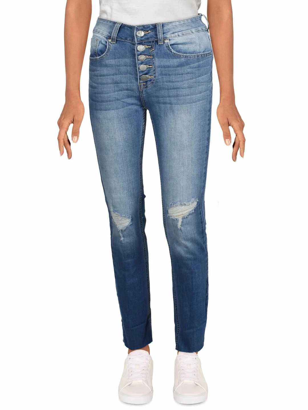 Step out in style in the Ace destroyed high rise straight leg jeans by Vigoss. Made with Cotton, Polyester, and Spandex. These jeans flaunt an eye catching straight silhouette, distressed knees, and chic cuffed hems. They are finished off with a high rise construction and sandblasted details. Five pocket design. Pair them with all your favorite everyday ensembles. Button fly. These jeans are guaranteed authentic.