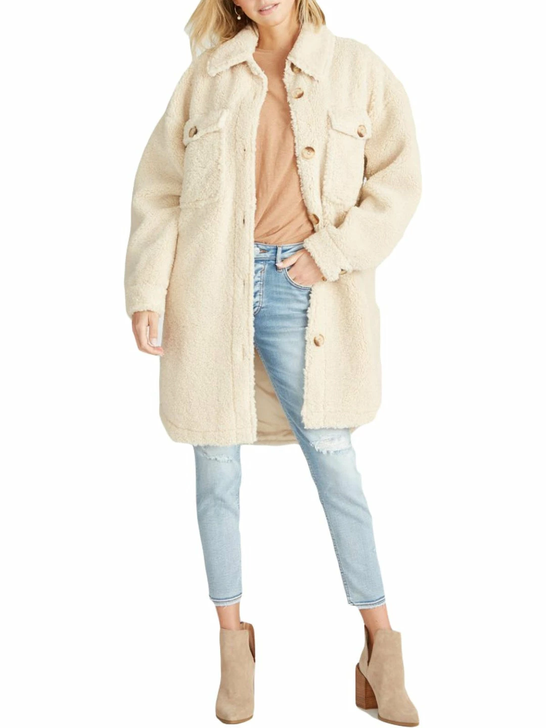 Stay toasty all season long in this faux fur mid-length shacket by Vigoss. Made with MATERIAL COMP. This trucker inspired style get’s a makeover with it’s long, mid-length silhouette and cozy faux fur fabric. It features two front patch pockets to hold your essentials. It’s roomy construction will allow you to layer it up with all your favorite cold weather ensembles. Spread collar. Button closures. This shacket is guaranteed authentic.