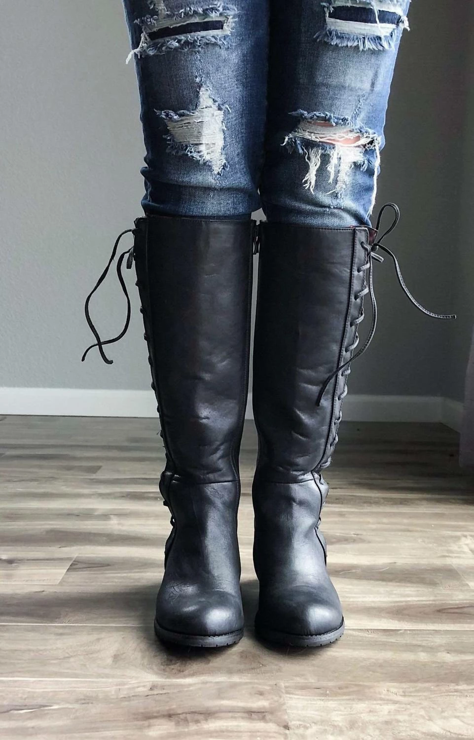 It has adorable corset sides with blacks, reds, and silvers to add that little pop of color. The corset design also allows you to adjust the calf size and fit Fit – True to Size.